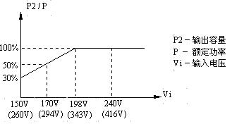 3、输出容量与输入电压的关系见下图,使用时应注意,不能过载使用;